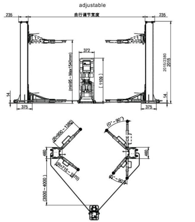 Manual two side lock release system. Without base plate, make width of the rack to be adjustable. Width adjustable, make it suitable for different size of car width. Lifting height: 1540mm total height: 2015mm. Movable Power unit trolley. It has been proofed by dynamic test with 125% of rated capacity and static test with 150% of rated capacity. Especially used for low garage shops. CE certificate.